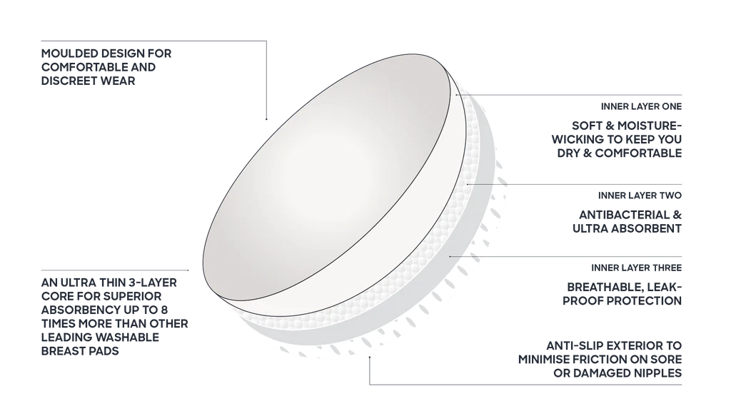 Moulded to contour your curves, our reusable Ultra Absorbent Breast Pads hold up to 30ml of breastmilk to keep you dry and comfortable for 8 hours of leak-proof protection. Designed to wick moisture away from your skin thanks to a quick-dry and antibacterial inner layer. Minimises movement and friction with an anti-slip exterior that clings to your bra.
