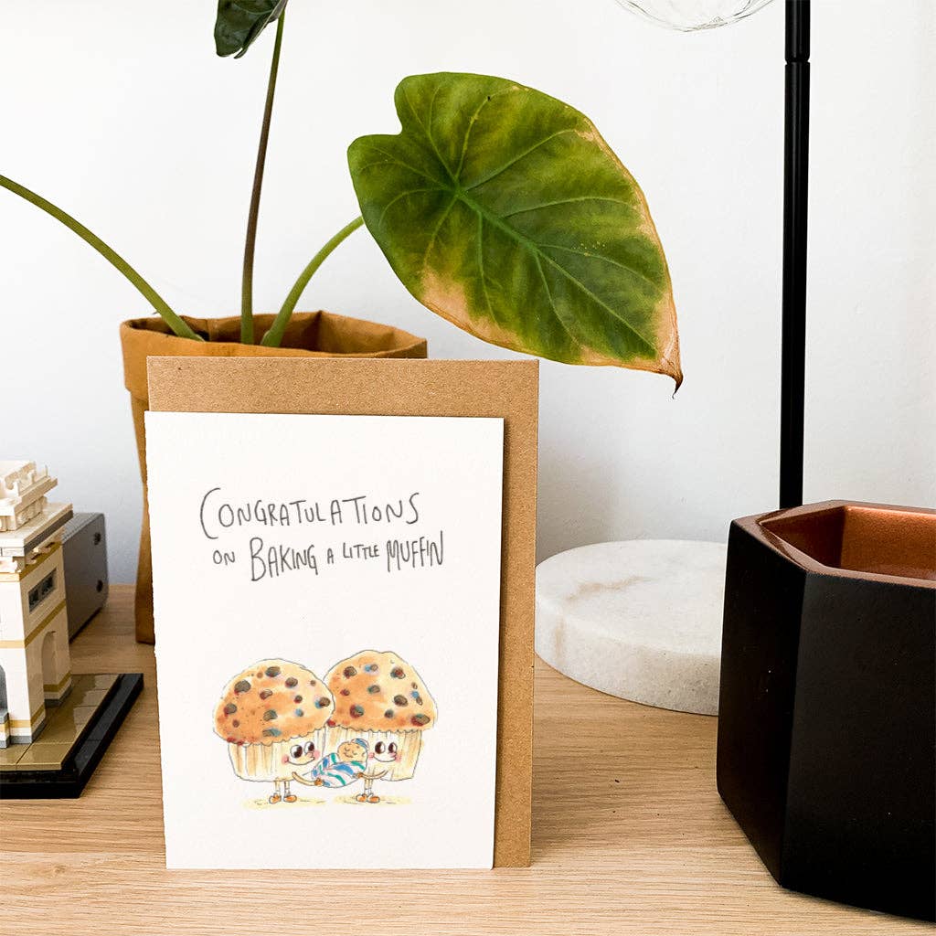 Featuring two proud muffin parents cradling their newborn muffin, this card is as heartwarming as a fresh batch straight out of the oven. Perfect for new parents, baby showers, or a thoughtful congratulations message, this card is guaranteed to spread smiles and warm hearts.