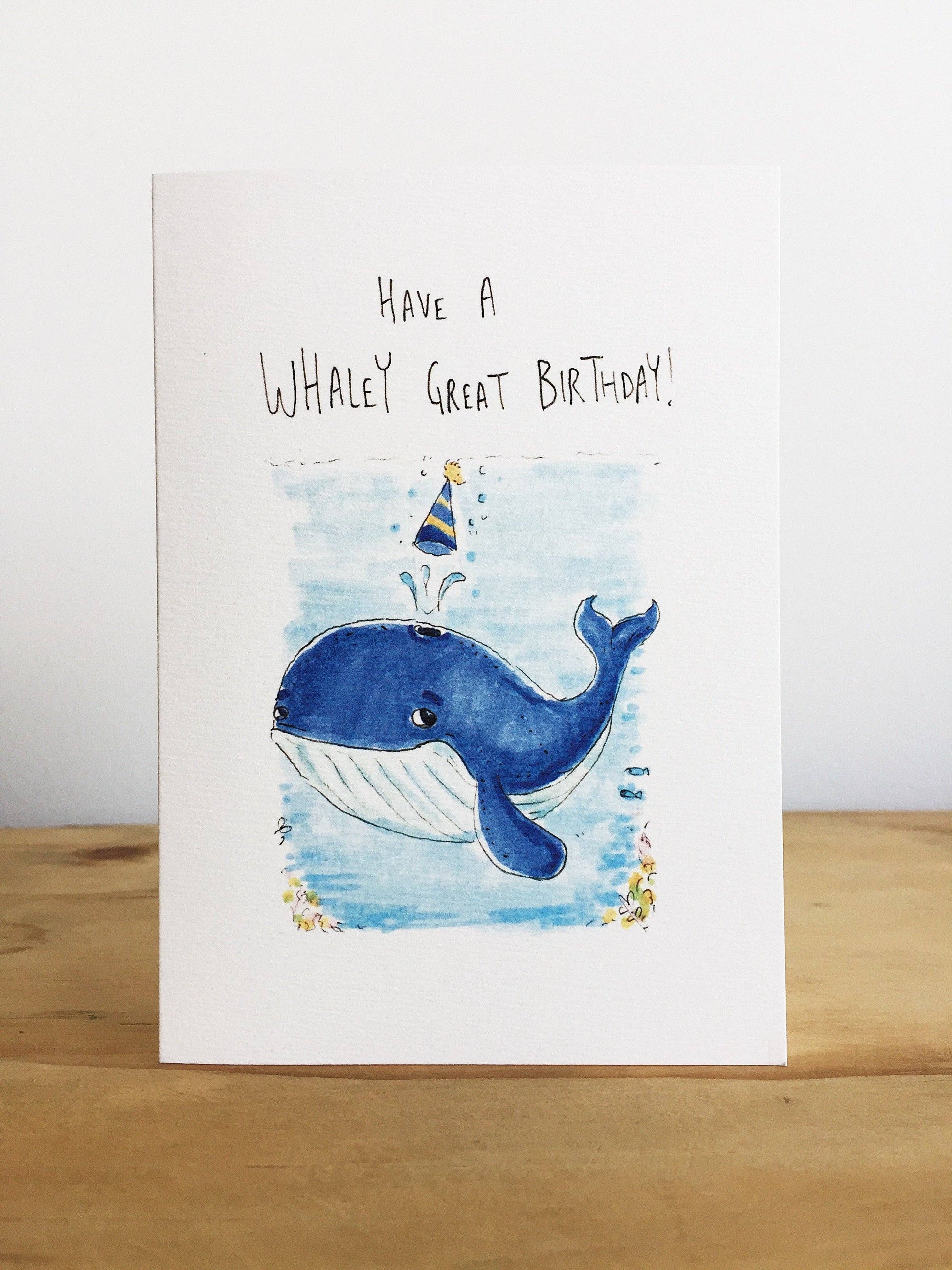A cute birthday card featuring a little whale and the words 'Have a Whaley Fun Birthday!' - a great card for a child's birthday, or for a whale lover! The card comes with a quality envelope and is sent in a protective, sturdy card-backed envelope. Wish someone special a whaley great birthday with this cute hand-made card. I'm sure it will work out swimmingly.