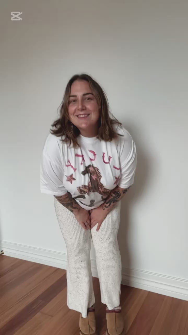 An oversized drop down tee, featuring the coolest lucky horse print. Perfect for your mama uniform! Pair with bike shorts, a mini skirt or striped pants. We recommend upsizing for an oversized look, especially sizes L and up.