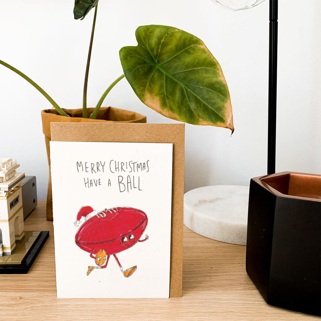 Featuring a cheeky Aussie rules footy in Santa boots, this hand-drawn greeting is a total kick for AFL lovers, local footy legends, or the mate who still wears their club socks to family lunch. Ideal for sports fans, backyard heroes, coaches, and anyone who’s ever played in 38°C heat in December. It's the perfect blend of cheer, competition, and cardio.