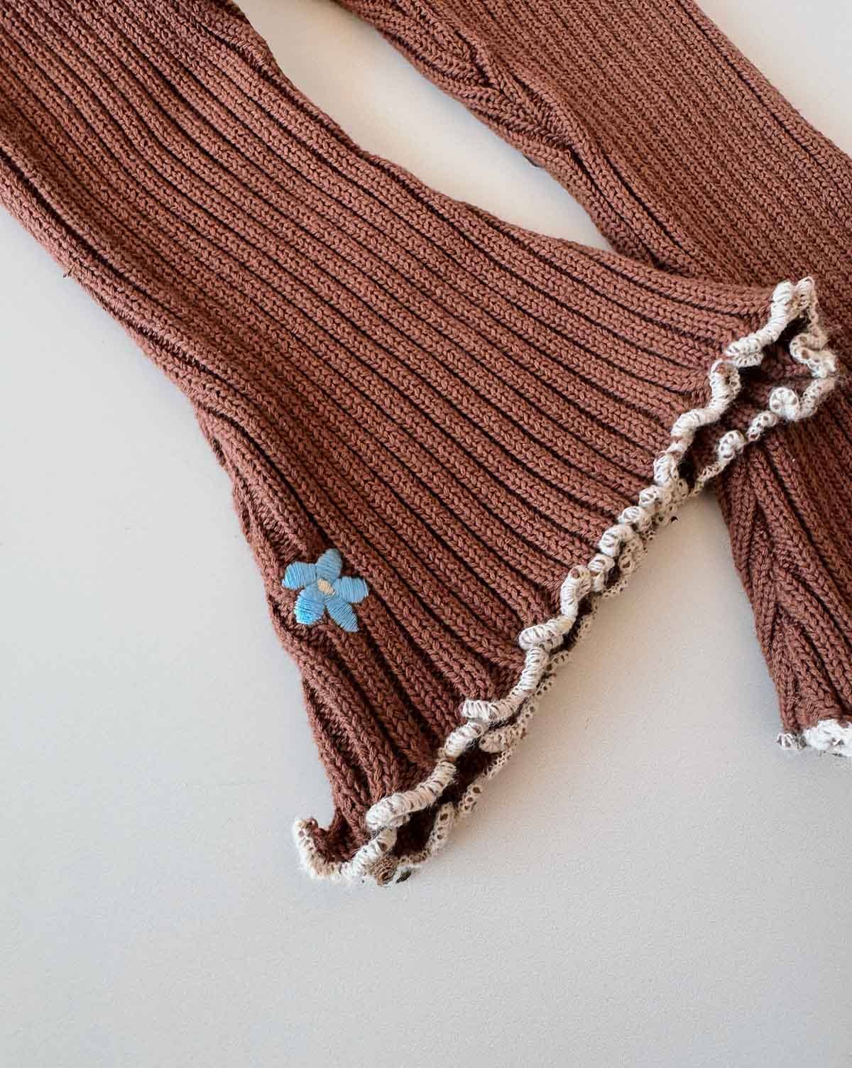 Stay warm with a nod to fun 70's flower power this winter with our Cotton Knit Bell Pants. The rib knit texture provides extra warmth, featuring a bluebell embroidery at the hem and a contrast cream baby lock hem for a chic ruffle look.