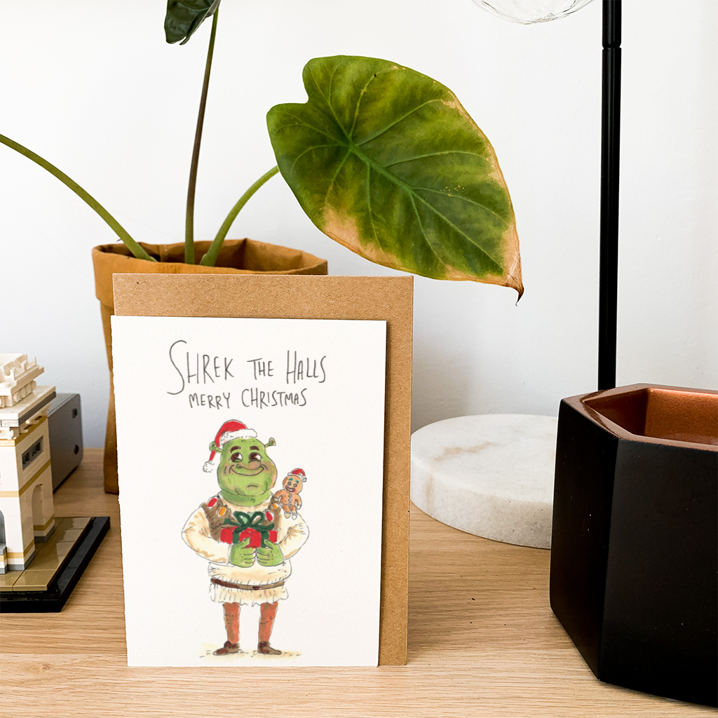 “Shrek the Halls” is the ultimate pun card for fairy-tale lovers, DreamWorks fans, or anyone who believes Christmas is better with layers. Featuring Shrek and Gingy in full festive mode, this card brings nostalgic cheer with a modern pun twist.
